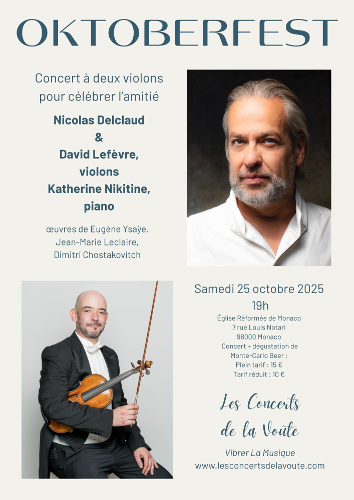 Les Concerts de la Voûte invite you to discover a duo of two great violinist friends: David Lefèvre, artistic director of Les Concerts de la Voûte and first violin soloist with the Monte-Carlo Philharmonic Orchestra, and Nicolas Delclaud, leader of the second violins in the same orchestra.