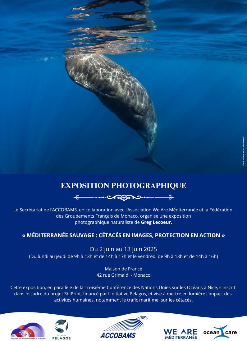 Le Secrétariat de l’ACCOBAMS, en collaboration avec l’Association We Are Méditerranée et la Fédération des Groupements Français de Monaco, organise une exposition photographique naturaliste de Greg Lecoeur.