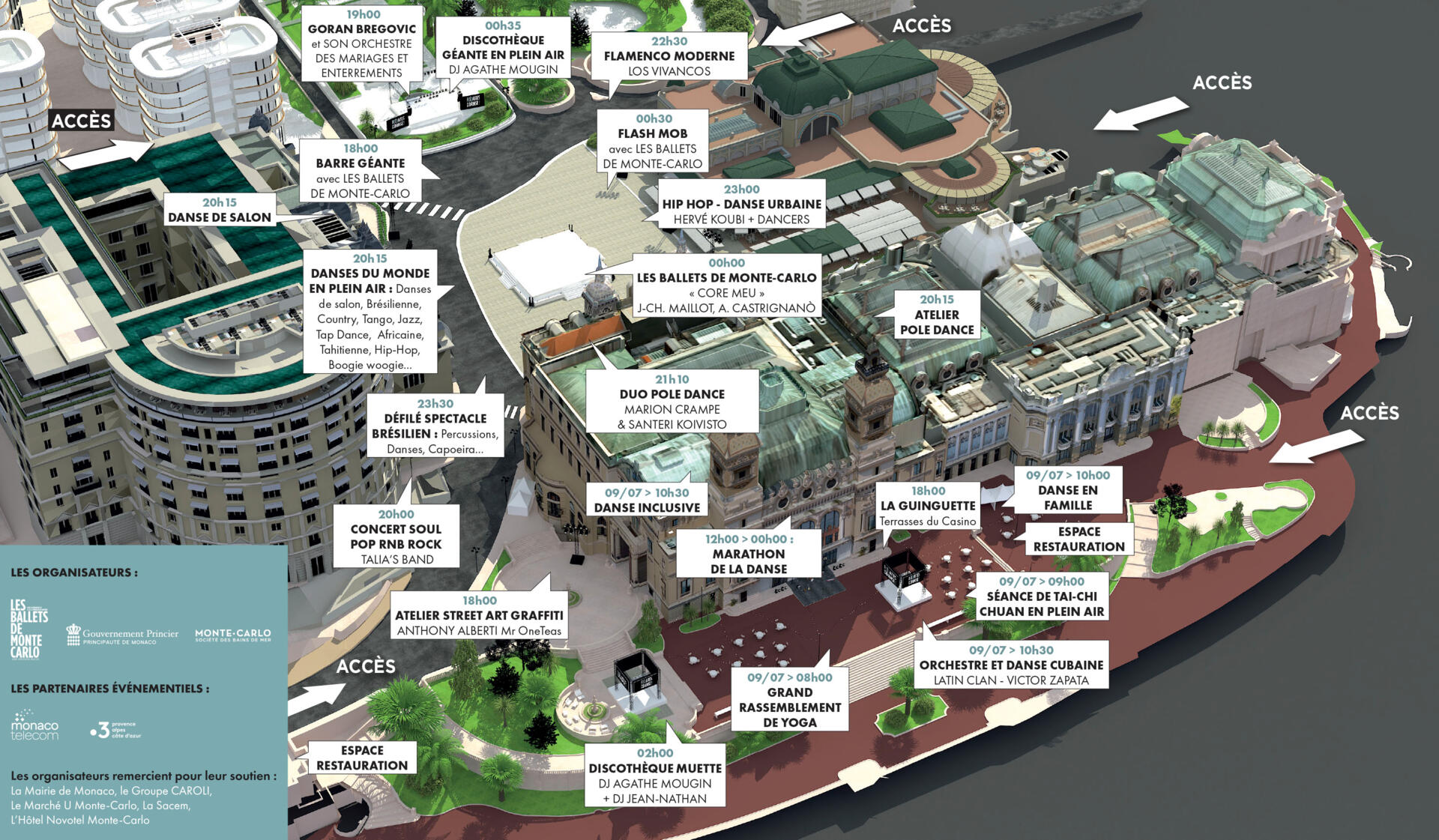 Danses de salon (ASM Danses Sportives), danse africaine (Association Flamboiyan), danse brésilienne (Vanessa Isacc Dance Company), hip-hop (Hervé Koubi + dancers), pole dance (Coaching & Pole Cassandra Carpinelli), tap dance (Roxane Butterfly), danse tahitienne (Vaiana Manutahi Tahiti Danse), tango argentin (Mayra Morelli & René Armando Copa), boogie woogie (William Mauvais & Maëva Truntzer, Ludovic Chanton & Stacy Aurel), country (Monaco Mayflower Country Steps-Anny Perez)