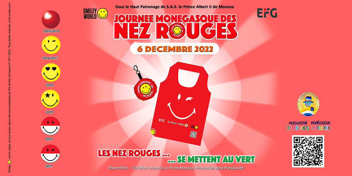 18° Giornata monegasca dei Nasi Rossi, organizzata dall'Associazione "Les enfants de Frankie" a sostegno dei bambini malati e disagiati del Principato e di tutta la regione PACA. QUEST'ANNO I NASI ROSSI DIVENTANO VERDI! Il "naso rosso" si sta adattando al mondo circostante e sta diventando un oggetto più ecologico e utile per i cittadini. La palla di gommapiuma diventa una "Shopping Bag" riutilizzabile e mantiene la forma del Naso Rosso quando viene chiusa.