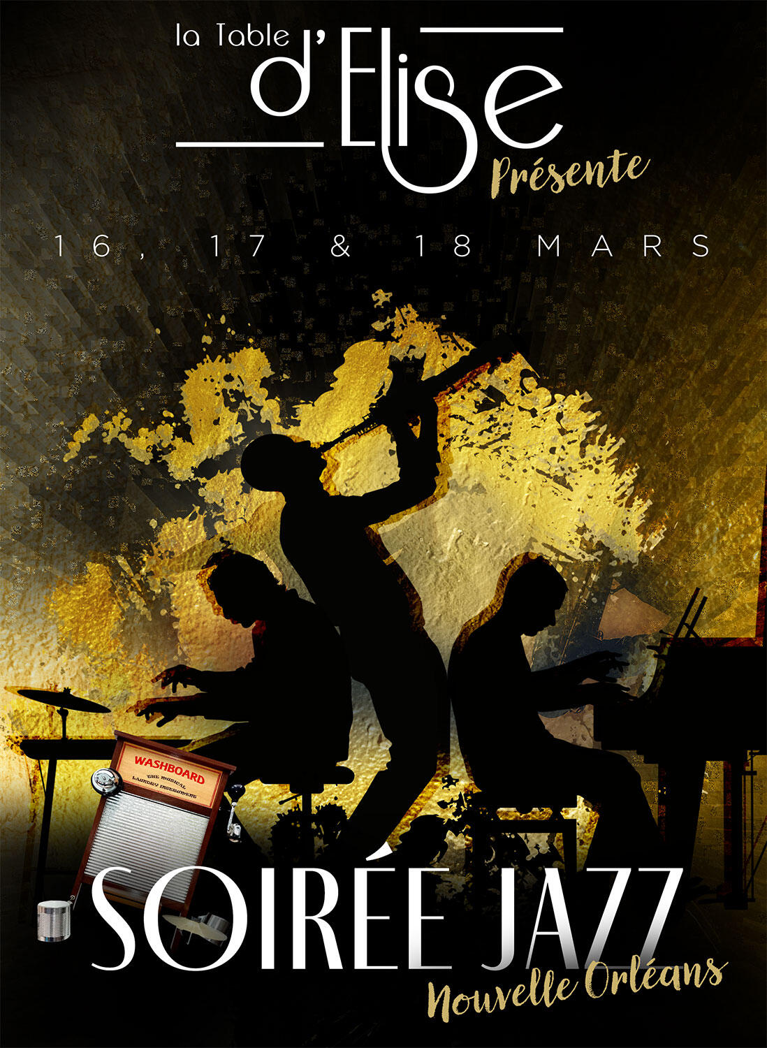 Siamo lieti di annunciare le imperdibili serate di New Orleans Jazz a La Table d'Elise il 16, 17 e 18 marzo! Venite a scoprire uno spettacolo in cui il "Trio Tonic" vi condurrà in un viaggio e vi farà dondolare con un'energia traboccante. Scoprirete anche la washboard, uno strumento musicale apparso a New Orleans.