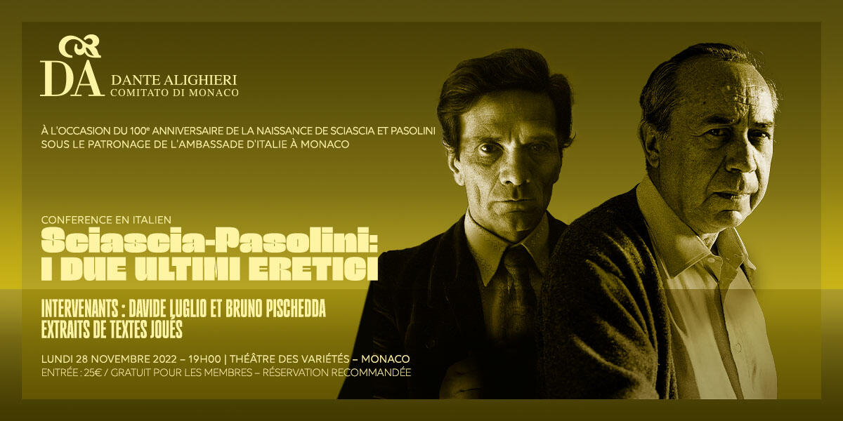 To mark the centenary of their birth (2021, 2022), two intellectuals like Sciascia and Pasolini are compared and contrasted by professors Luglio and Pischedda, who praise their skills as polemicists - engaged in a fierce battle with the beliefs of their era - whilst retaining a critical perspective. Two "heretical" personalities, as has often been said, whose respective journalistic writings and works merit painstaking analysis. With inevitable differences, Sciascia and Pasolini left lasting impressions through their writings, which today compel us to face a number of often provocative and paradoxical theses. Organised by Dante Alighieri Monaco.