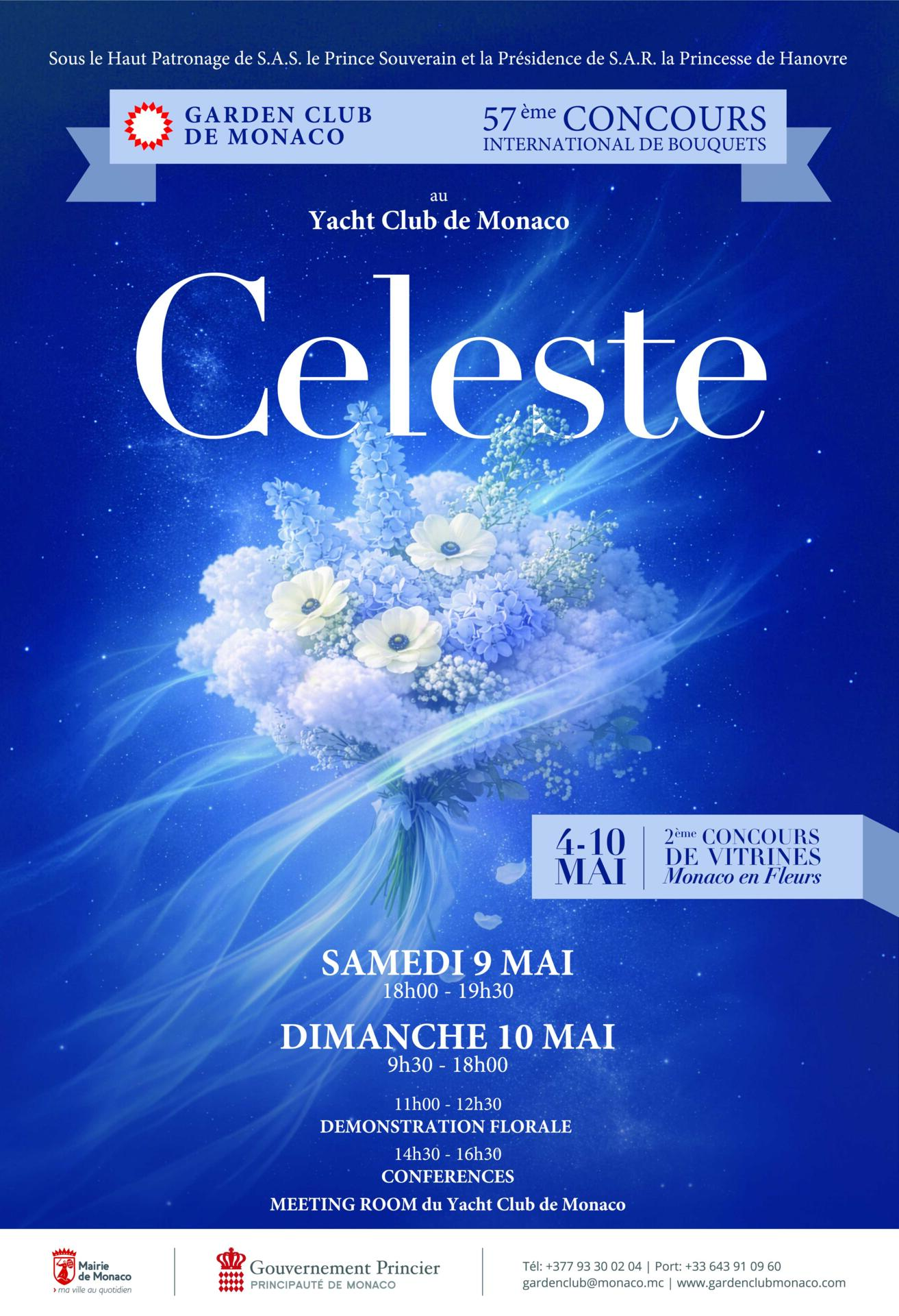 Il pubblico è invitato a scoprire le creazioni floreali del 57° Concorso Internazionale di Bouquet di Monaco, sul tema “CELESTE”, il 9 e 10 maggio 2026 allo Yacht Club di Monaco.