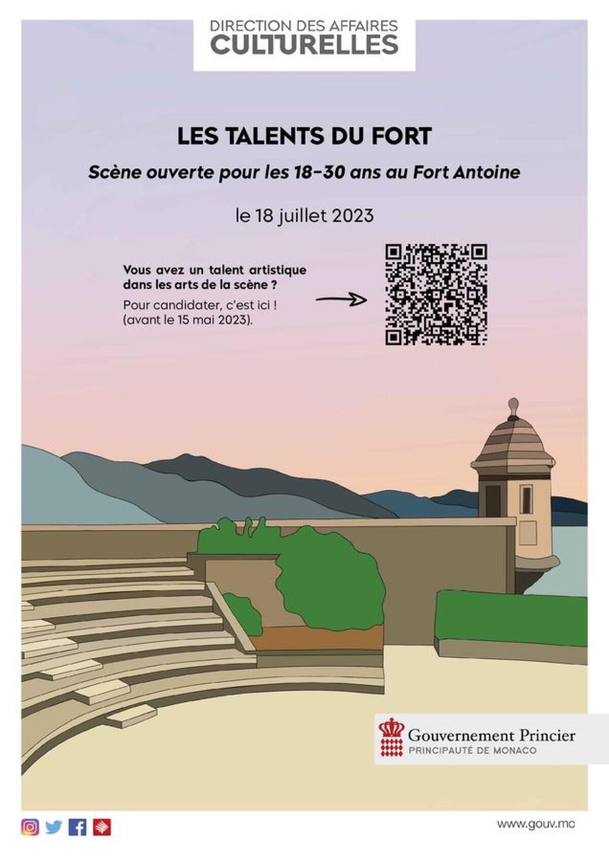 Per continuare a dare visibilità ai giovani talenti del Principato e a potenziare i legami tra cultura e gioventù, martedì 18 luglio 2023 sarà organizzato un palcoscenico aperto per i giovani e dai giovani a Fort Antoine. Per i giovani prima di tutto, poiché permetterà a persone di età compresa tra i 18 e i 30 anni di rivelare il proprio talento sul magico palcoscenico del Fort Antoine, che si tratti di musica, teatro o danza. Le modalità di partecipazione sono molto semplici: basta iscriversi entro il 15 maggio compilando un modulo online. Poi dai giovani, perché proponiamo che un comitato di 5 giovani (tra i 18 e i 30 anni) organizzi quest'iniziativa, in collaborazione con le équipe del DAC. Dalla tecnica alla comunicazione, dalla logistica alle scelte artistiche, gestiranno tutti gli aspetti dell'organizzazione di un evento culturale, per farne un successo.